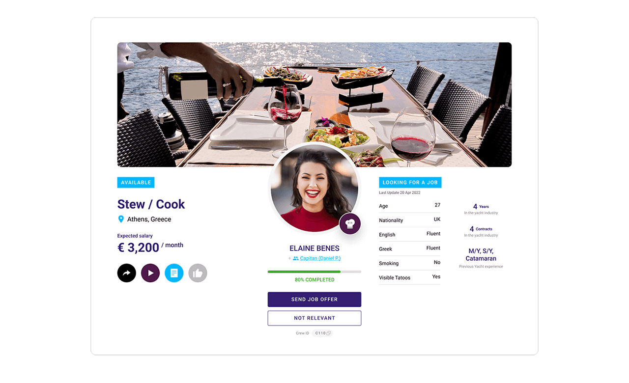 Comparable CV layout focusing on relevant information, accurate calculation of years of experience, yacht history, documents status and courses. Learn more about the candidate with a cover letter, video presentation and additional photos